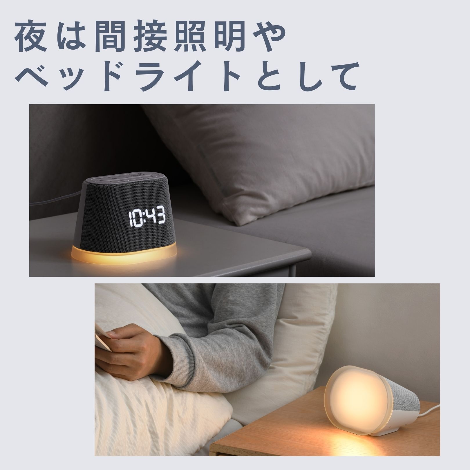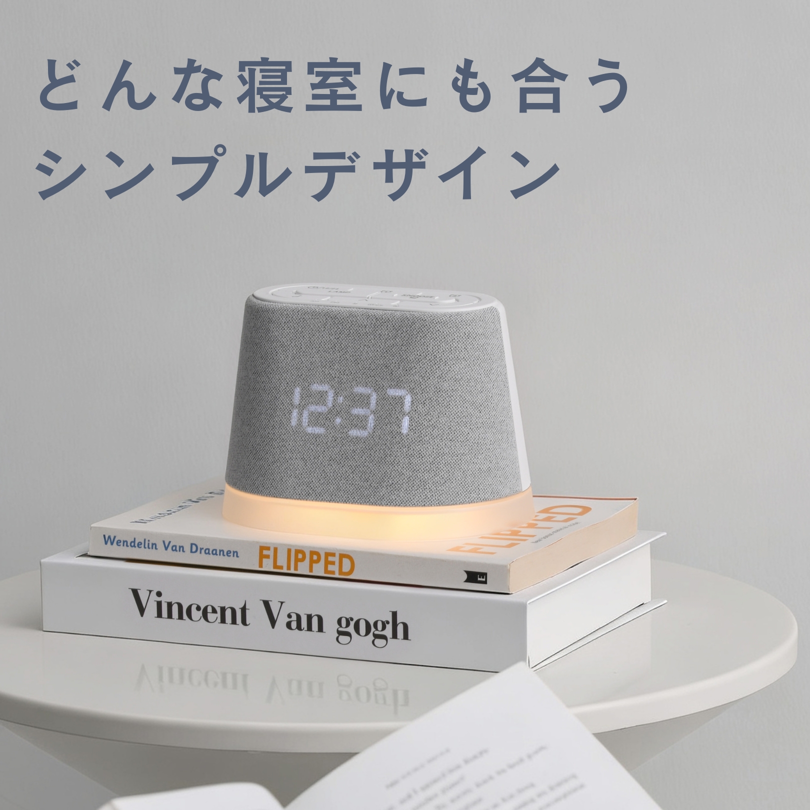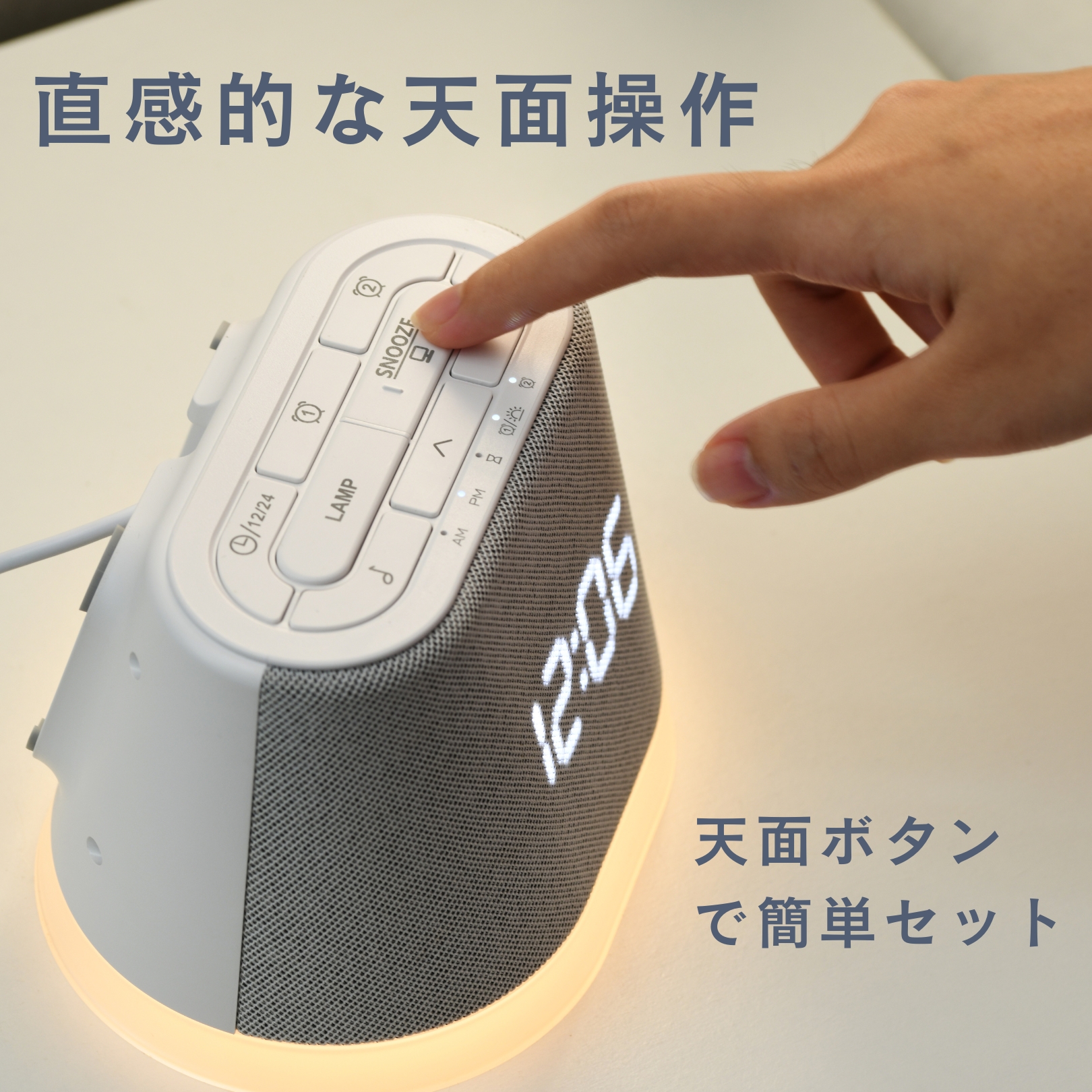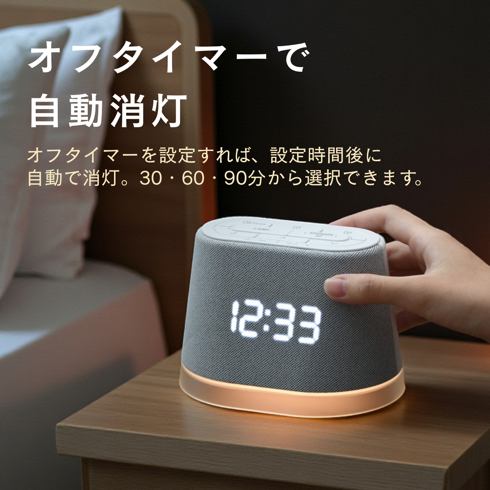 【インテリアに溶け込む上質な布製デザイン】: 筐体には温かみのあるファブリック(布製)素材を採用し、プラスチック特有の無機質さを排除しました。液晶表示の明るさも「強・中・弱・OFF」の4段階で切り替え可能なため、夜間でも眩しすぎることなく寝室の雰囲気を壊しません 。