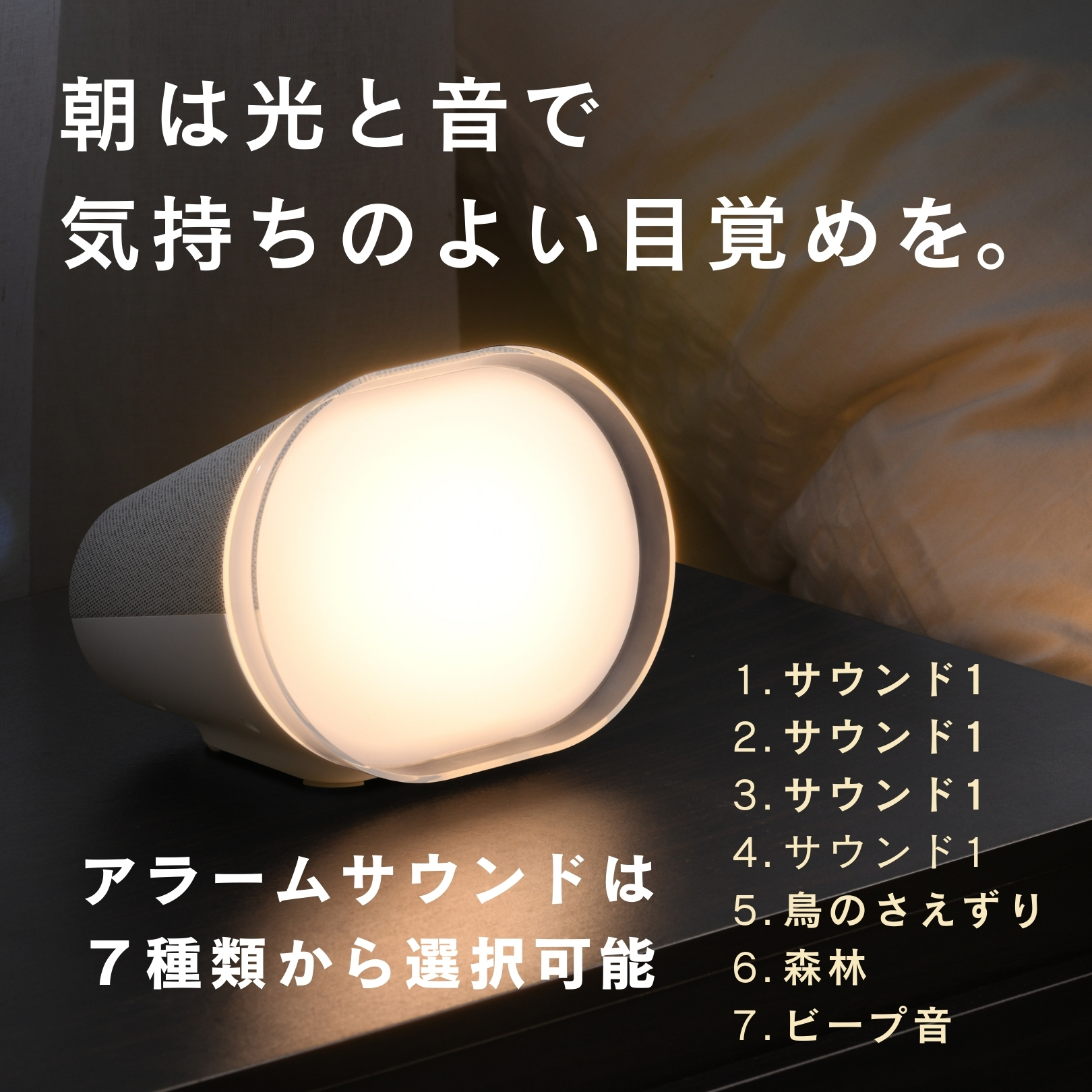 【光で目覚める新習慣・サンライズアラーム】: アラーム設定時刻の10分前からライトがゆっくりと点灯を開始し、設定時間に最大輝度へ到達することで、太陽光を浴びるような自然な目覚めをサポートします 。